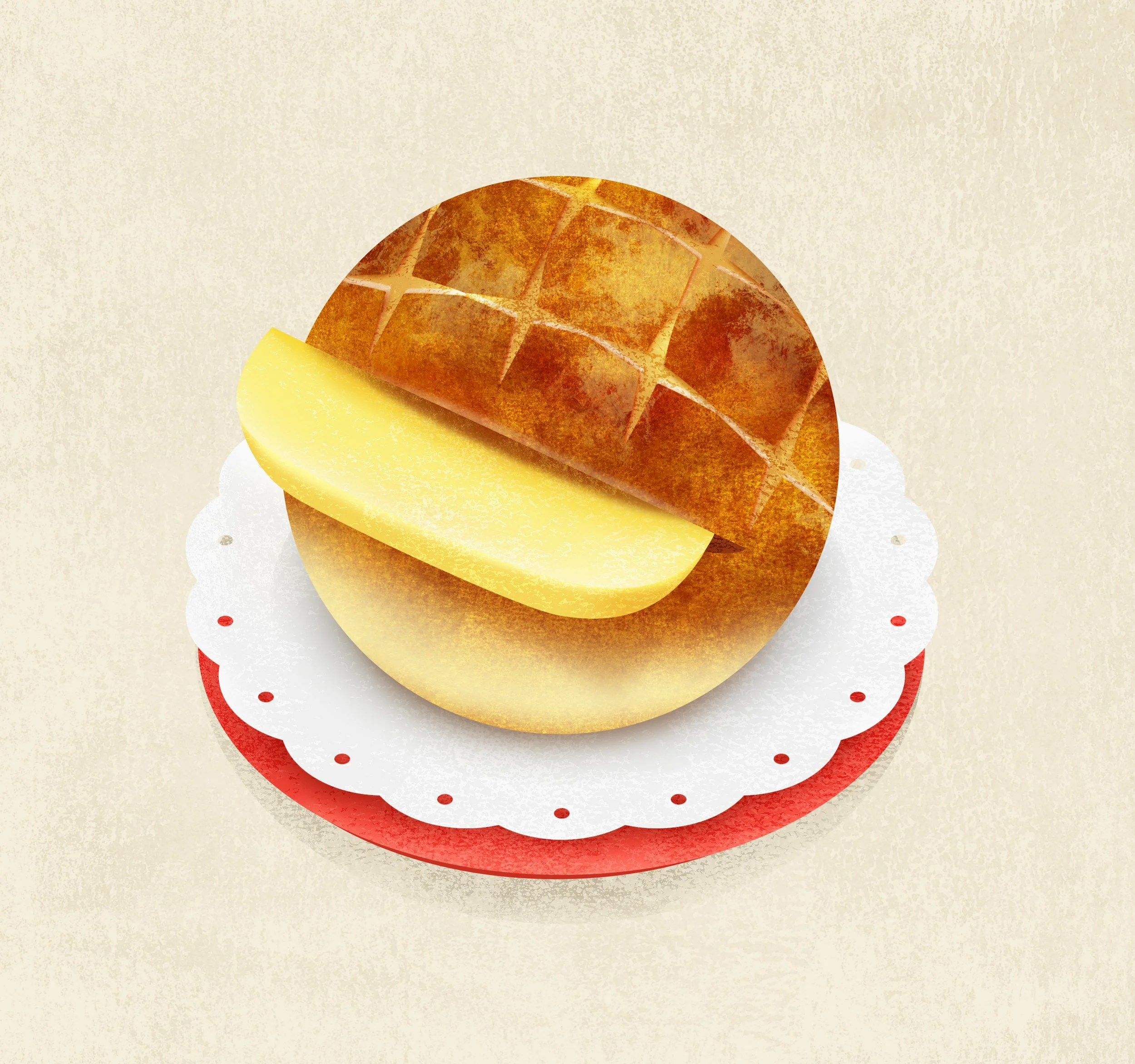 Pineapple bun with thick slice of butter. “Pineapple bun without pineapple”, a classic meme of all ages in Hong Kong. It has nothing to do with pineapple but the appearance of the crust. In Japan people usually call this pattern as Melon bread, not the same thing though.